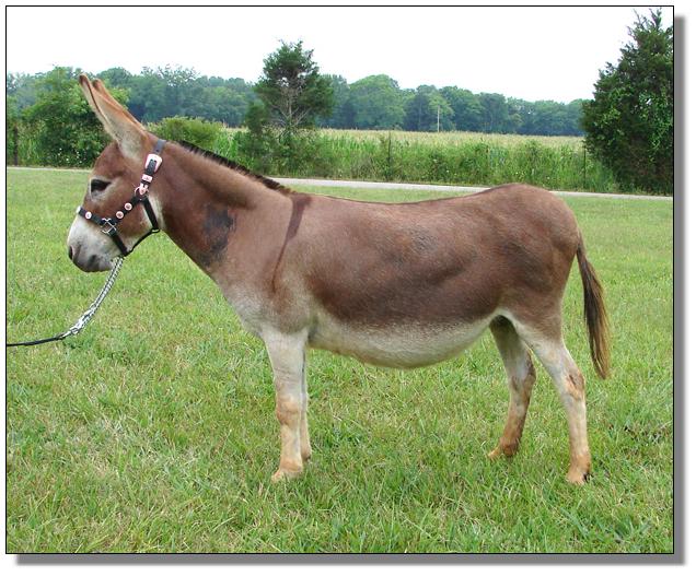 Daphne is a sweetheart of a donkey with a beautiful head. She has a lot of roaning throughout her coat. Daphne was checked NOT in foal by an exterior ultrasound at UT vet school in Knoxville on 11/19/07. We have owned her for over six months and her previous owner had her for two years. Since she has never had a foal according to her breeder we are now offering Daphne as a barren jennet. You could not ask for a sweeter jennet. Easy to catch and work with and up to date on all vaccinations. She would make a fantastic driving donkey, companion or just a wonderful pet. She will have a current negative coggins and a health certificate if sold out of state.